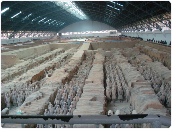 首先到的第一站便是秦始皇兵馬俑,當(dāng)我們走進(jìn)展廳時(shí),一個(gè)個(gè)冷峻的武士,一件件古老的兵器,仿佛要立刻把我?guī)肽菓?zhàn)國時(shí)期秦王一掃六國的戰(zhàn)場一般,它們讓我們感受到秦國的戰(zhàn)爭與生活。大家驚嘆,這個(gè)氣勢太宏偉了,不得不佩服古代人民智慧和力量!人都說感受古文化須七分聽,三分看,我們圍在導(dǎo)游身邊聽她熟練的介紹,不知不覺的參觀了一號(hào)到四號(hào)坑,除了一號(hào)坑是已經(jīng)出土兵馬俑外,其余的二個(gè)坑均未出土文物,有一個(gè)坑是空坑。聽說如果現(xiàn)代挖掘技術(shù)不能完全攻克,有生之年還看不到更精彩的出土文物,雖感到遺憾,但還是希望這些文物能夠完整保留,必竟是先人遺留下來的寶貴財(cái)富。