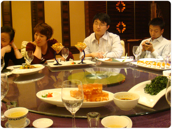 另一道西安文化大餐就是西安飯莊,西安飯莊位于西安市繁華市區(qū)-東大街,于鐘樓咫尺之距,交通便利。它建于一九二九年,素以“陜菜正宗”、“陜西風(fēng)味大全”聞名于世,曾接待過周恩來、葉劍英等黨和國家領(lǐng)導(dǎo)人,張學(xué)良、楊虎城等愛國將領(lǐng)及老舍、柳青等文化名流。哈哈,在這里我們不僅能感受西安小吃文化,更重要的是飽眼福的同時(shí)可以讓我們真正的一飽口福,經(jīng)過一天的景點(diǎn)游覽,我們已經(jīng)饑腸轆轆了!服務(wù)員,趕緊上菜嘍!哇,肉夾饃,黃桂柿餅,西安包子、哨子面、粉魚,滿滿一大桌,太讓人解饞了!